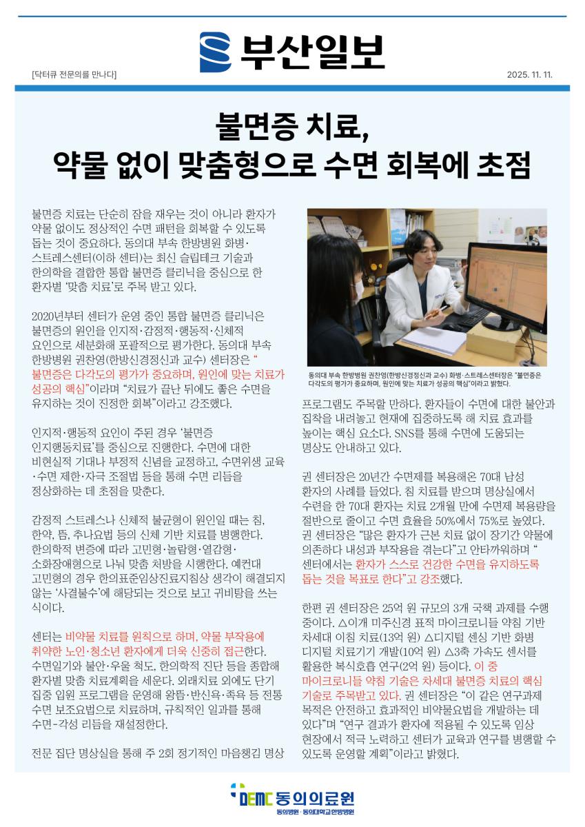 [소식] [부산일보] 불면증 치료, 약물 없이 맞춤형으로 수면 회복에 초점 작성자관리자 작성일2025-11-11 조회262 부산일보 기사 바로보기 링크 이전글 [강좌] 동의건강교실 (11/20) - 뇌졸중 예방과 건강한 노후 설계 다음글 [강좌] 토요 한방교실 (11/15) - 안면마비 & 협착증과 디스크