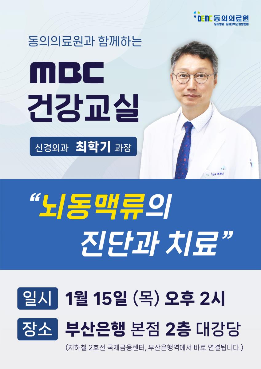 [강좌] MBC 건강교실 (1/15) - 뇌동맥류의 진단과 치료 작성자관리자 작성일2025-12-22 조회675 이전글 [소식] [국제신문] 쉴틈없는 연말 감기몸살... 공진단 등 효과 다음글 [소식] [국제신문] 연골 손상 범위 작다면 건강한 연골세포 이식으로 조직 재생