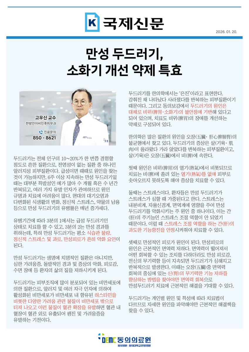 [소식] [국제신문] 만성 두드러기, 소화기 개선 약제 특효 작성자관리자 작성일2026-01-21 조회429 국제신문 기사 바로가기 링크 . . . 이전글 [강좌] 목요 건강강좌 (1/29) - 위암, 대장암 조기검진의 중요성 다음글 [소식] 한방 광채·수분 새해 클리닉 30% 할인 특가 행사