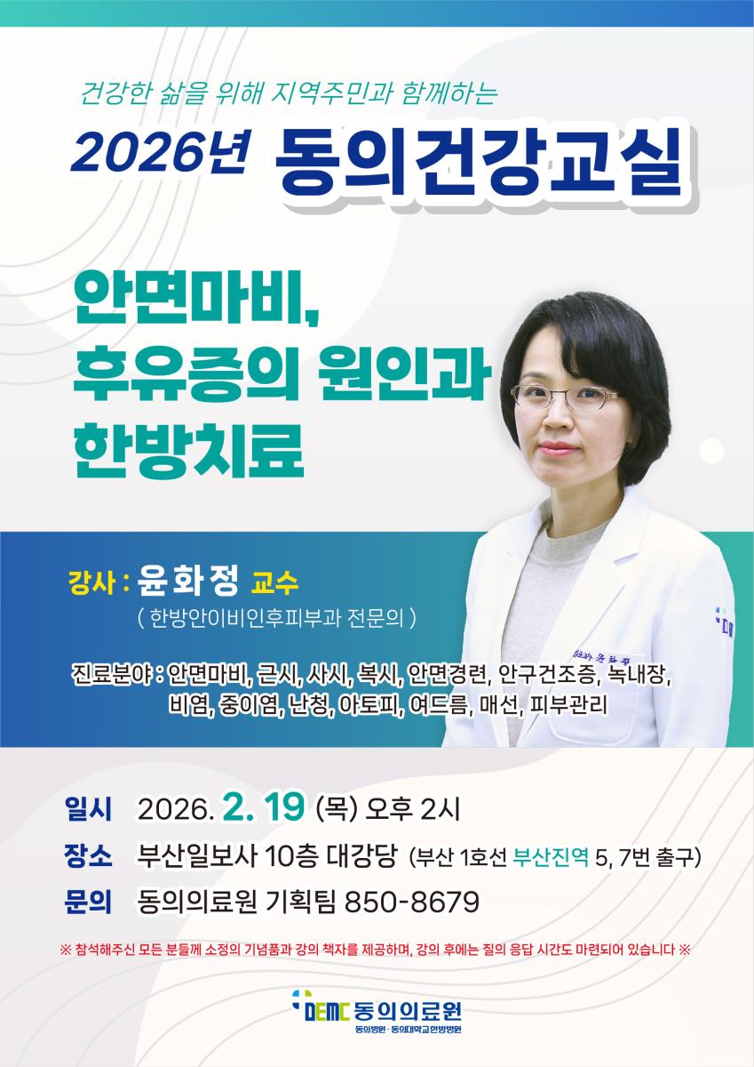 [강좌] 동의건강교실 (2/19) - 안면마비, 후유증의 원인과 한방치료 작성자관리자 작성일2026-02-09 조회479 이전글 [공지] 2026년 설 연휴 휴진 안내 다음글 [강좌] 목요 건강강좌 (1/29) - 위암, 대장암 조기검진의 중요성
