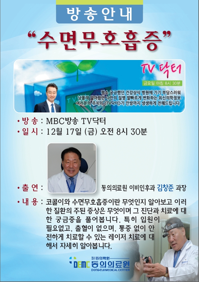 [방송] 방송출연 안내 - MBC TV닥터 작성자관리자 작성일2010-12-07 조회16570 이전글 [방송] 방송출연 안내 - MBC TV닥터 다음글 [방송] 방송출연 안내 - KBS1 TV 무엇이든물어보세요