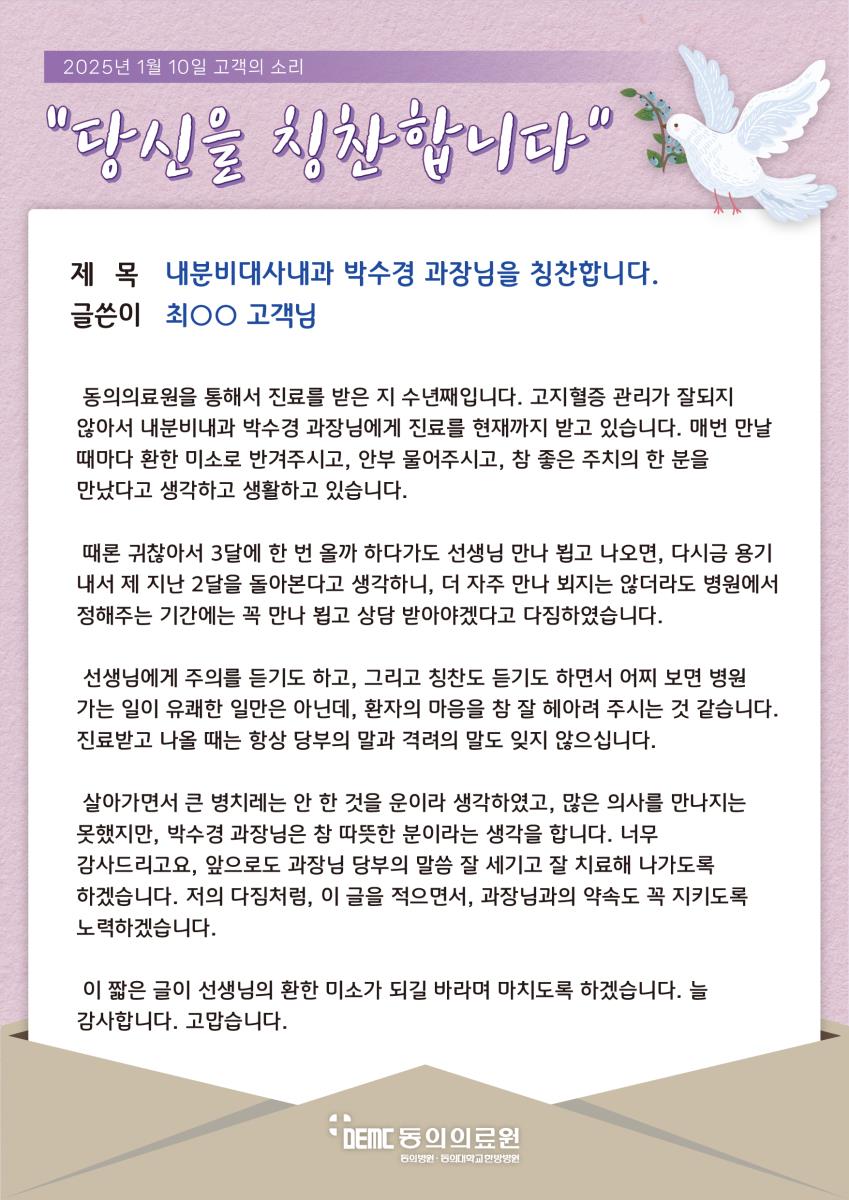 내분비대사내과 박수경 과장님을 칭찬합니다. 작성자관리자 작성일2025-02-14 조회1022 이전글 도수치료 담당해주신 물리치료사 노영삼 과장님께 다음글 김준형 과장님께 늦게나마 감사의 인사를 드립니다.