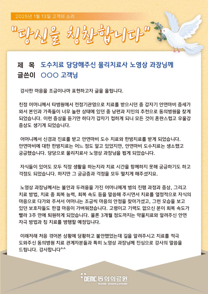 도수치료 담당해주신 물리치료사 노영삼 과장님께 작성자관리자 작성일2025-02-14 조회1026 이전글 42병동을 만나게 되어 너무 감사합니다. 다음글 내분비대사내과 박수경 과장님을 칭찬합니다.