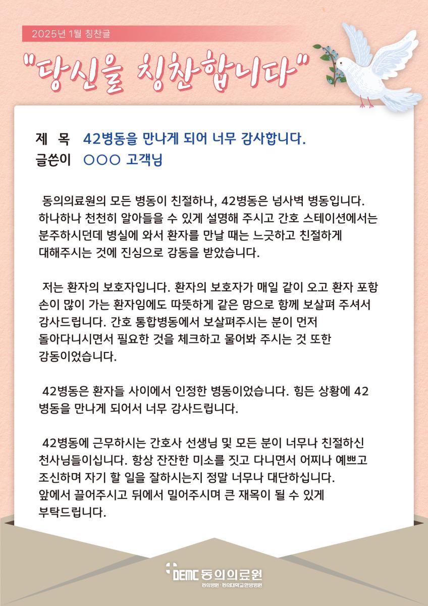 42병동을 만나게 되어 너무 감사합니다. 작성자관리자 작성일2025-02-19 조회994 이전글 81병동 간호사님들을 꼭 칭찬해주세요! 다음글 도수치료 담당해주신 물리치료사 노영삼 과장님께