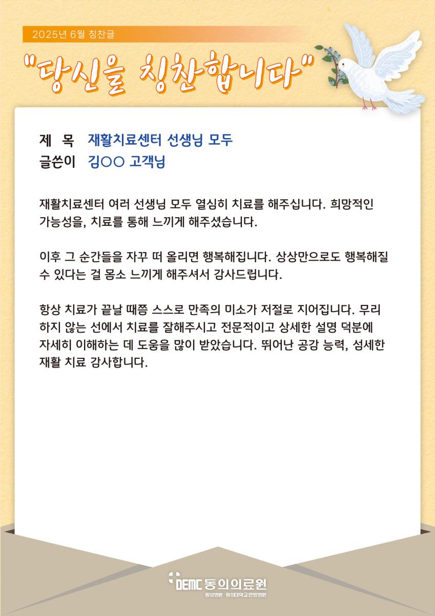 ※ 고객님의 치료후기 작성은 고객의 소리 메뉴에서 가능합니다.