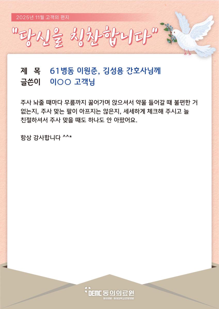 ※ 고객님의 치료후기 작성은 고객의 소리 메뉴에서 가능합니다.