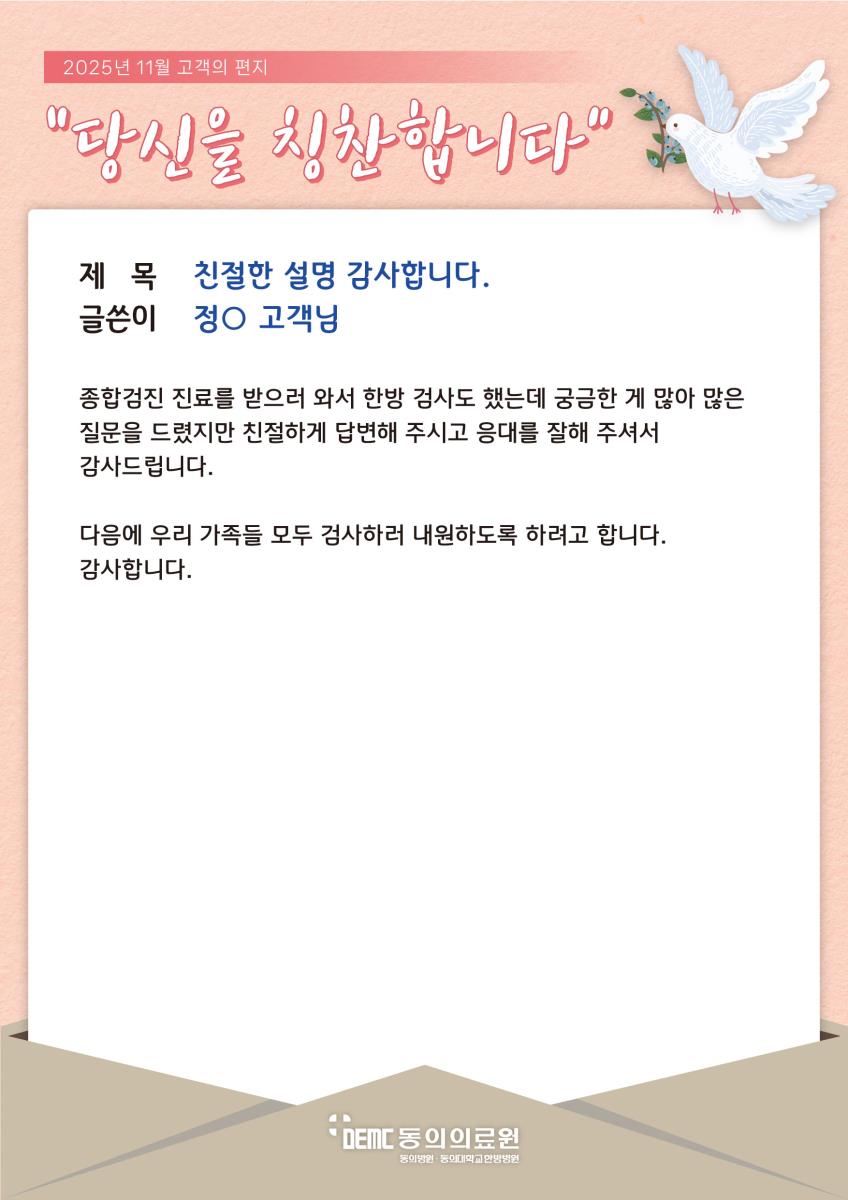※ 고객님의 치료후기 작성은 고객의 소리 메뉴에서 가능합니다.