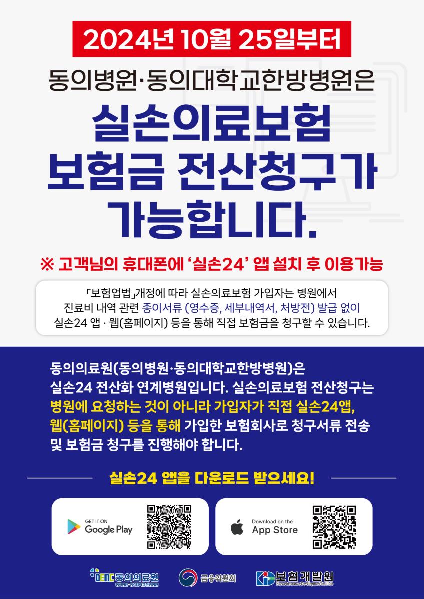 [공지] 실손의료보험 청구 전산화 시행 작성자관리자 작성일2024-11-20 조회2418 실손24 웹(홈페이지) : https://www.silson24.or.kr/claim/web 이전글 [공지] 설 연휴 진료 안내 다음글 [공지] 10월 진료일정 안내