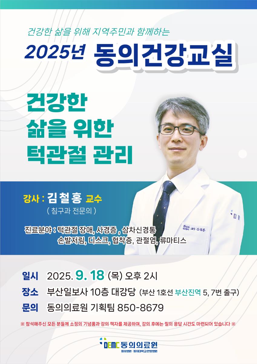 [강좌] 동의건강교실 (9/18) - 건강한 삶을 위한 턱관절 관리 작성자관리자 작성일2025-09-12 조회1038 이전글 [강좌] 토요 한방교실 (9/20) - 뇌졸중 & 체질건강 다음글 [강좌] 명의특강 (9/4) - 난청, 이렇게 하면 들린다.