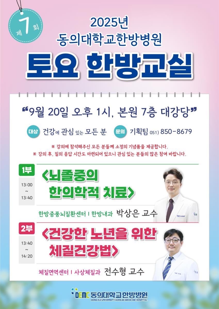 [강좌] 토요 한방교실 (9/20) - 뇌졸중 & 체질건강 작성자관리자 작성일2025-09-15 조회910 이전글 [강좌] 목요 건강강좌 (9/25) - 당뇨병 환자의 지질 관리 다음글 [강좌] 동의건강교실 (9/18) - 건강한 삶을 위한 턱관절 관리