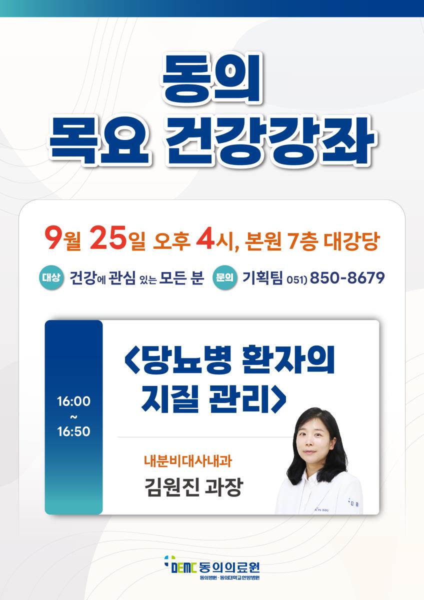 [강좌] 목요 건강강좌 (9/25) - 당뇨병 환자의 지질 관리 작성자관리자 작성일2025-09-22 조회932 이전글 [강좌] 동의건강교실 (10/16) - 어지럼증의 이해와 관리 다음글 [강좌] 토요 한방교실 (9/20) - 뇌졸중 & 체질건강