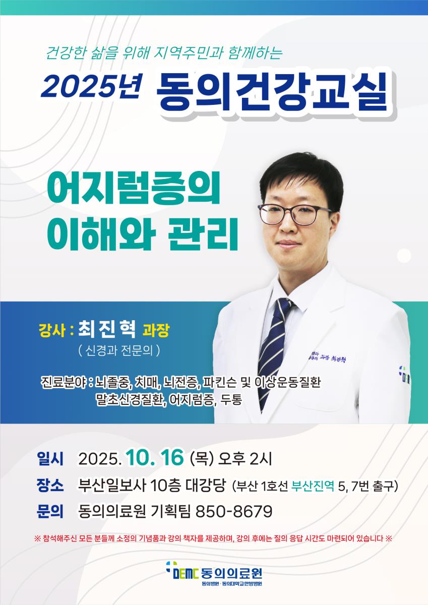 [강좌] 동의건강교실 (10/16) - 어지럼증의 이해와 관리 작성자관리자 작성일2025-10-10 조회834 이전글 [강좌] 토요 한방교실 (10/18) - 수족냉증 & 불면증 다음글 [강좌] 목요 건강강좌 (9/25) - 당뇨병 환자의 지질 관리