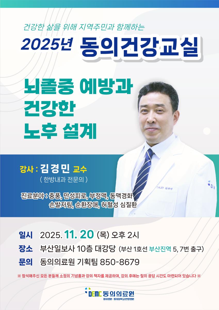 [강좌] 동의건강교실 (11/20) - 뇌졸중 예방과 건강한 노후 설계 작성자관리자 작성일2025-11-14 조회676 이전글 [강좌] 목요 건강강좌 (11/27) - 만성기침 다음글 [소식] [부산일보] 불면증 치료, 약물 없이 맞춤형으로 수면 회복에 초점
