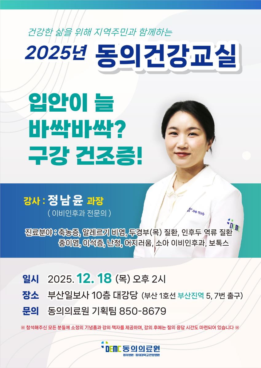 [강좌] 동의건강교실 (12/18) - 구강 건조증 작성자관리자 작성일2025-12-09 조회507 이전글 [강좌] 토요 한방교실 (12/20) - 비뇨기 질환 & 목 통증과 손 저림 다음글 [강좌] 목요 건강강좌 (12/4) - 피부질환의 한방치료