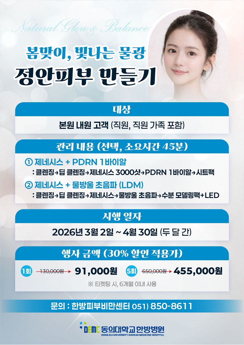 [소식] 한방 정안피부 만들기 30% 할인 특가 행사 작성자관리자 작성일2026-03-03 조회121 이전글 [공지] 외부 공사에 따른 병원 진입로 통제 및 우회 안내 다음글 [강좌] 목요 건강강좌 (2/26) - 자궁근종의 최소침습적 수술치료