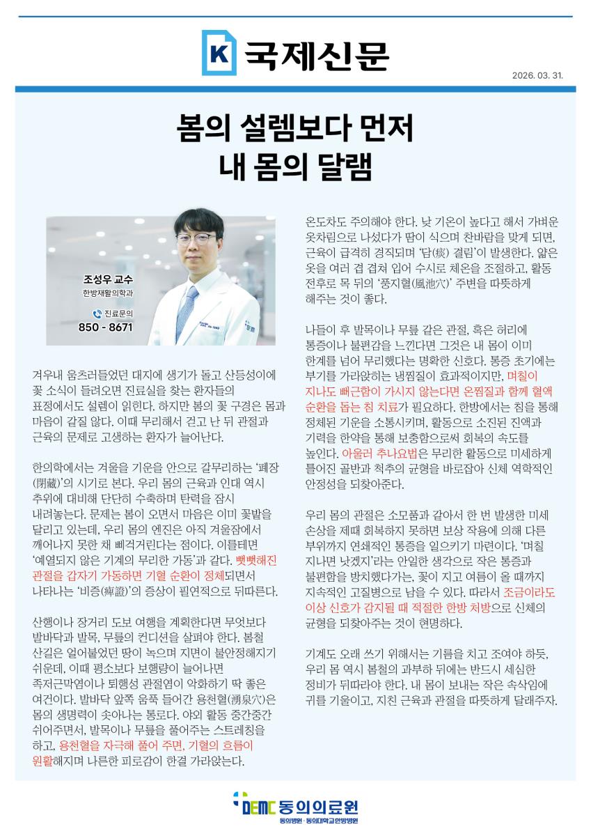 [소식] [국제신문] 봄의 설렘보다 먼저 내 몸의 달램 작성자관리자 작성일2026-04-01 조회149 국제신문 기사 원문 바로보기 이전글 [소식] [코메디닷컴] 근육, 면역, 불면, 콩팥, 단백질... 헷갈리는 건강정보, 한 번에 짚는다 다음글 [공지] 5월~6월 공휴일 진료 일정 안내