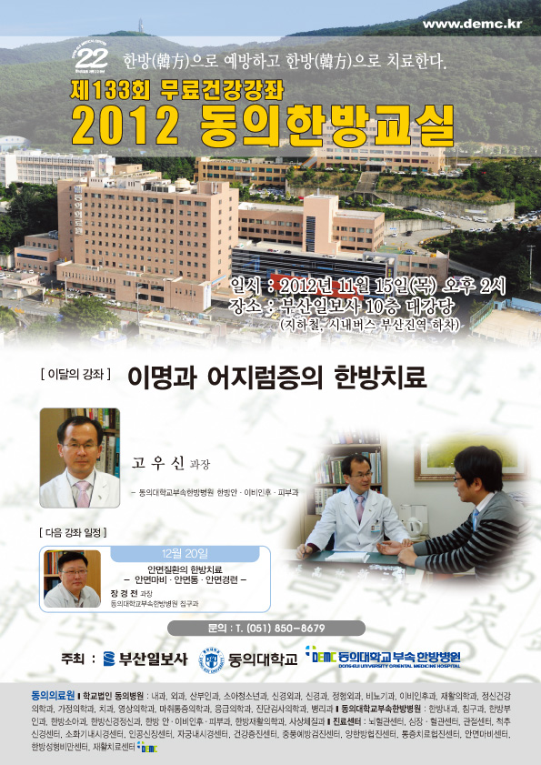 [강좌] [동의한방교실] 이명과 어지럼증의 한방치료 - 2012. 11. 15 - 작성자관리자 작성일2012-10-24 조회16572 이전글 [강좌] [MBC 건강교실] 뇌졸중과 어지럼증 - 2012. 11. 28 - 다음글 [방송] [방송안내 - MBC TV닥터] ‘자궁근종’