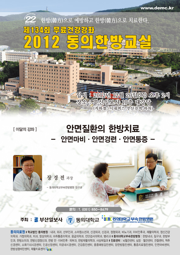 [강좌] [동의한방교실] “안면질환의 한방치료”안면마비·안면경련·안면통증-2012.12.20 작성자관리자 작성일2012-11-20 조회16889 이전글 [소식] 동의대학교한방병원 한방재활의학과 다음글 [강좌] [MBC 건강교실] 뇌졸중과 어지럼증 - 2012. 11. 28 -