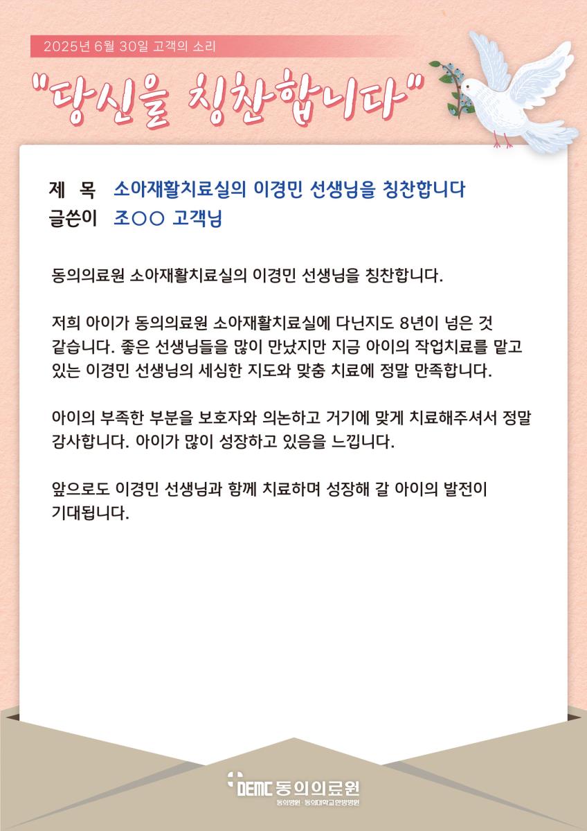 소아재활치료실의 이경민 선생님을 칭찬합니다. 작성자관리자 작성일2025-07-11 조회587 이전글 수술실 선생님들 감사합니다! 다음글 박수경 과장님과 42병동 선생님들 덕분입니다.