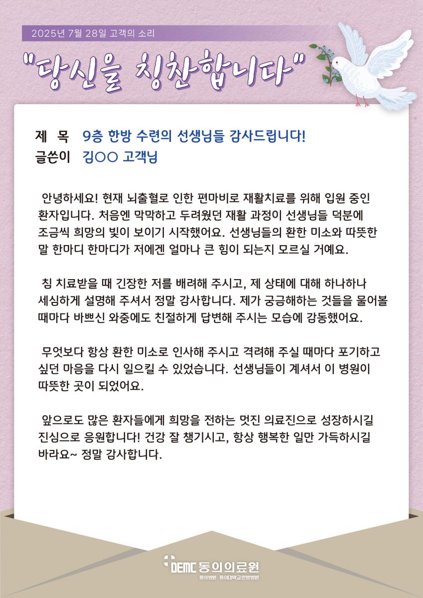9층 한방 수련의 선생님들 감사드립니다! 작성자관리자 작성일2025-08-12 조회468 이전글 2층 물리치료실 이유진 선생님 감사합니다 ^^ 다음글 2층 신경계 물리치료실 선생님들 감사합니다.
