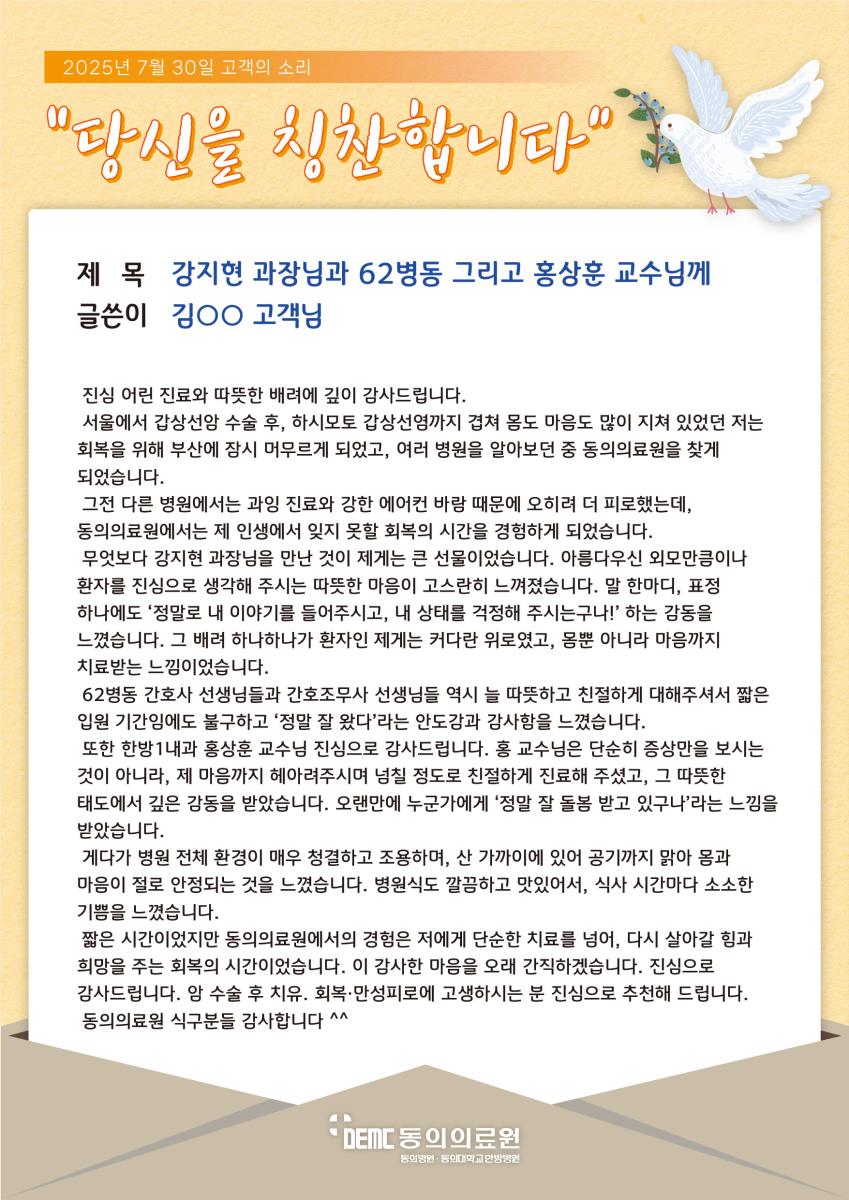 ※ 고객님의 치료후기 작성은 고객의 소리 메뉴에서 가능합니다.