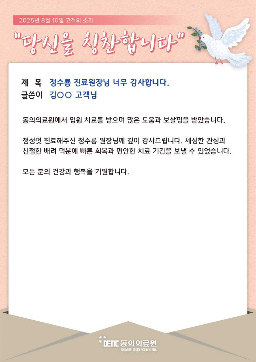 ※ 고객님의 치료후기 작성은 고객의 소리 메뉴에서 가능합니다.