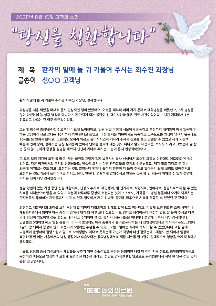 환자의 말에 늘 귀 기울여 주시는 최수진 과장님 작성자관리자 작성일2025-09-09 조회455 이전글 한방척추관절센터 조성우 교수님을 칭찬합니다. 다음글 정수룡 진료원장님 너무 감사합니다.