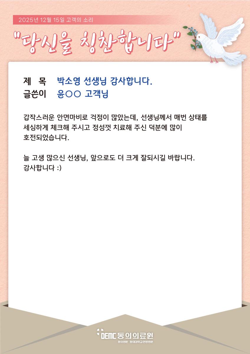 ※ 고객님의 치료후기 작성은 고객의 소리 메뉴에서 가능합니다.