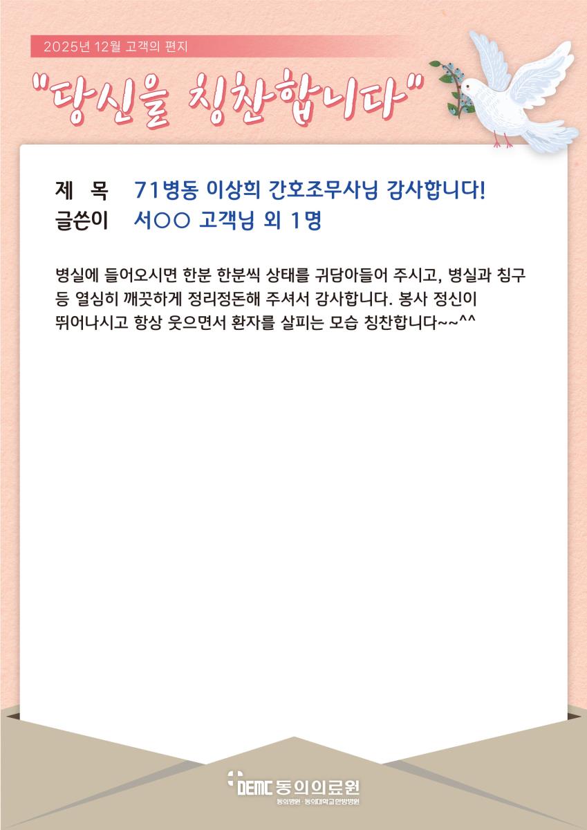 ※ 고객님의 치료후기 작성은 고객의 소리 메뉴에서 가능합니다.